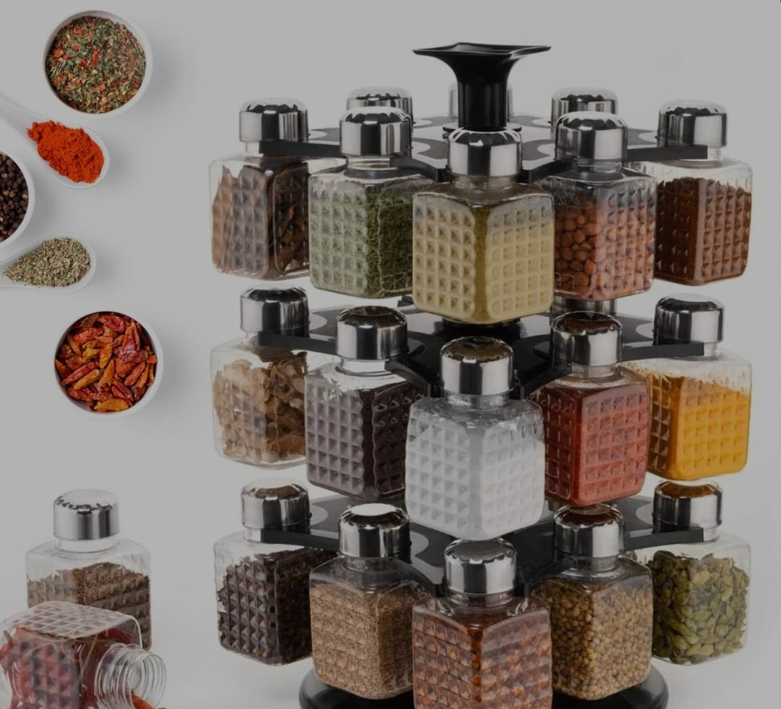 5504 All New Square 24 Bottle Design 360 Degree Revolving Spice Rack Container Condiment, Pieces Set, Square Small Container (MOQ: 3 Pc). Innovative compact design and fresh new aesthetics with transparent body for easy viewing.
