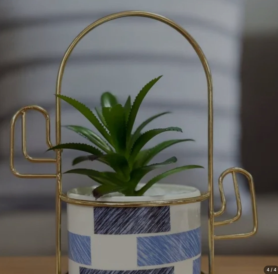Add a pop of greenery and modern style to your decor with this artificial aloe vera plant housed in a premium ceramic pot featuring a trendy blue and black geometric tile design. The pot is beautifully cradled in a sleek golden metal frame, making it an eye-catching accent piece for any tabletop, shelf, or desk. Perfect for those who want the charm of plants without the upkeep, this maintenance-free decor makes a perfect gift or home accessory. Key Features: Realistic artificial aloe vera plant with vibrant texture Premium ceramic pot with blue-black rectangular pattern Elegant golden metal holder with artistic side handles Ideal for living rooms, bedrooms, workspaces, and gifting No watering, sunlight, or maintenance required Lightweight, durable, and stylish for modern interiors artificial aloe vera plant, modern ceramic planter, geometric indoor pot, decorative tabletop plant, home decor succulent, blue pattern planter, gift plant for office, gold metal stand pot, maintenance-free decor, stylish artificial greenery Country Of Origin non returnable product.